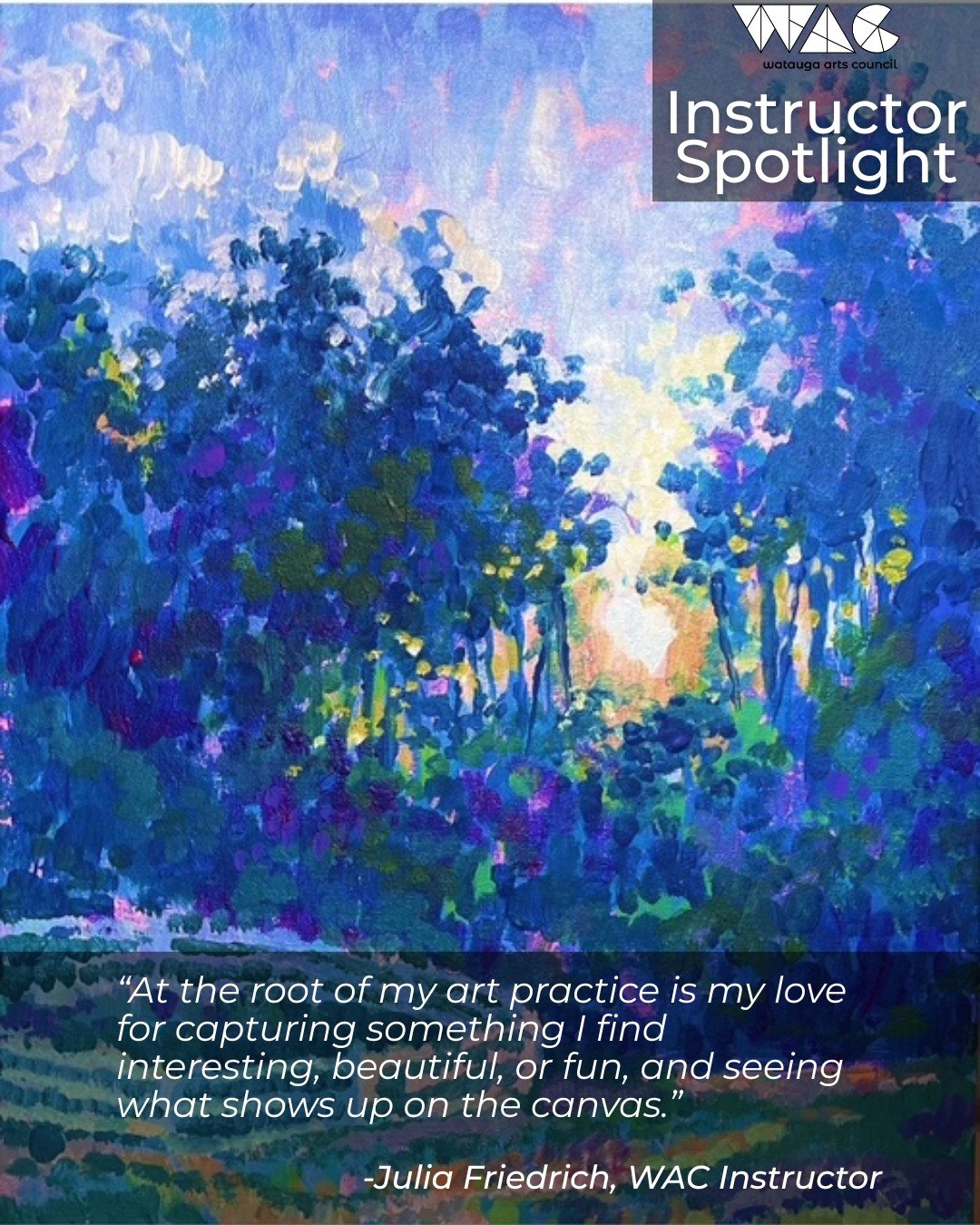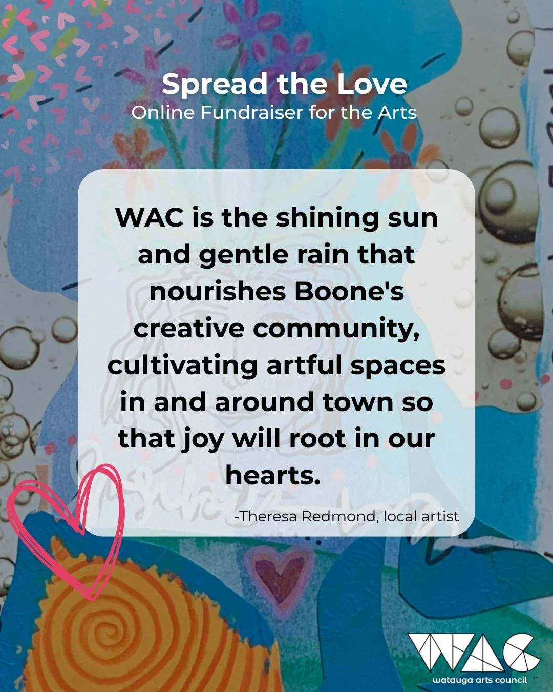 The Watauga Arts Council (WAC) fosters a thriving, diverse, vibrant, creative community through arts advocacy, education, support, and inspiration.