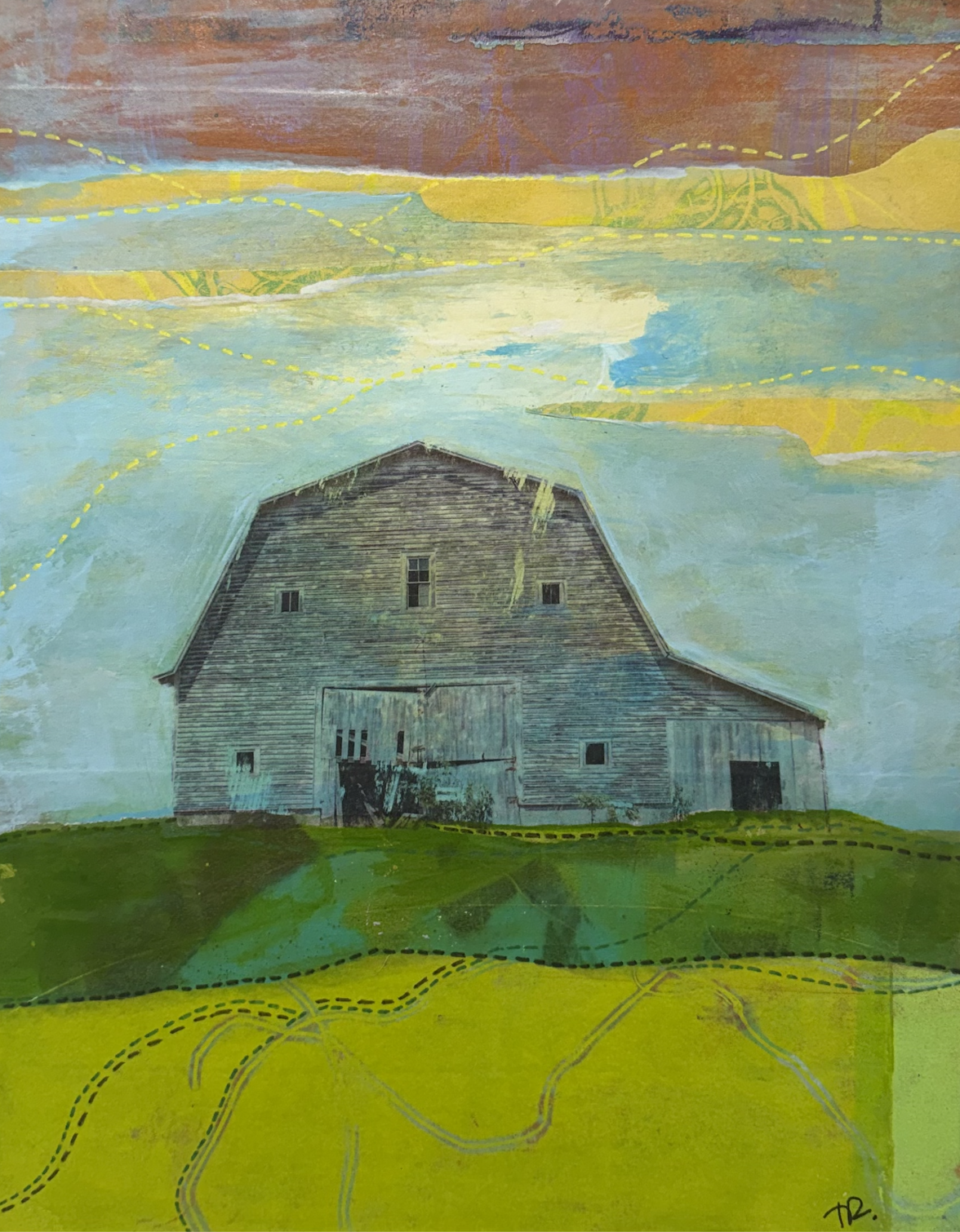 “I created "Threads of Mountain Light" by combining one-of-a-kind hand-pulled gelli plate prints with botanicals from my garden and stencils digitized from my sketchbooks. I layered these original papers with upcycled book pages that I made with washes of acrylic paint. My approach to mixed media collage is akin to quilting as I focus heavily on piecing and layering. After creating the background, I used an image transfer technique to overlay a photo that I took of the Henson barn (formerly located at 134 Deerfield Road in Boone, NC) before it was demolished. To bring the photo together with the quilted background, I added touches of acrylic paint alongside hand-drawn stitching with paint marker. The piece is finished with cold wax.”