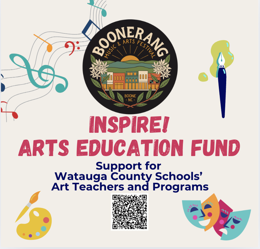 Boonerang Music and Art Festival have partnered with Watauga Arts to provide support for Watauga County Schools arts educators and their programs. Art educators can apply for special projects, equipment, or professional development. This applies to visual arts, theatre, chorus, and band.