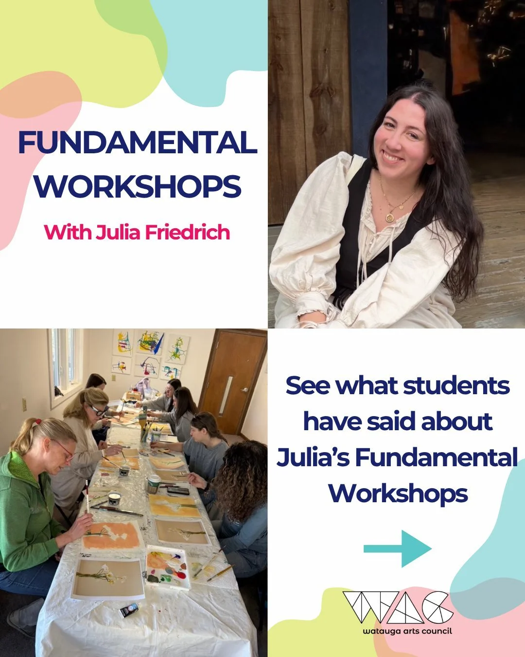 The Watauga Arts Council (WAC) fosters a thriving, diverse, vibrant, creative community through arts advocacy, education, support, and inspiration.