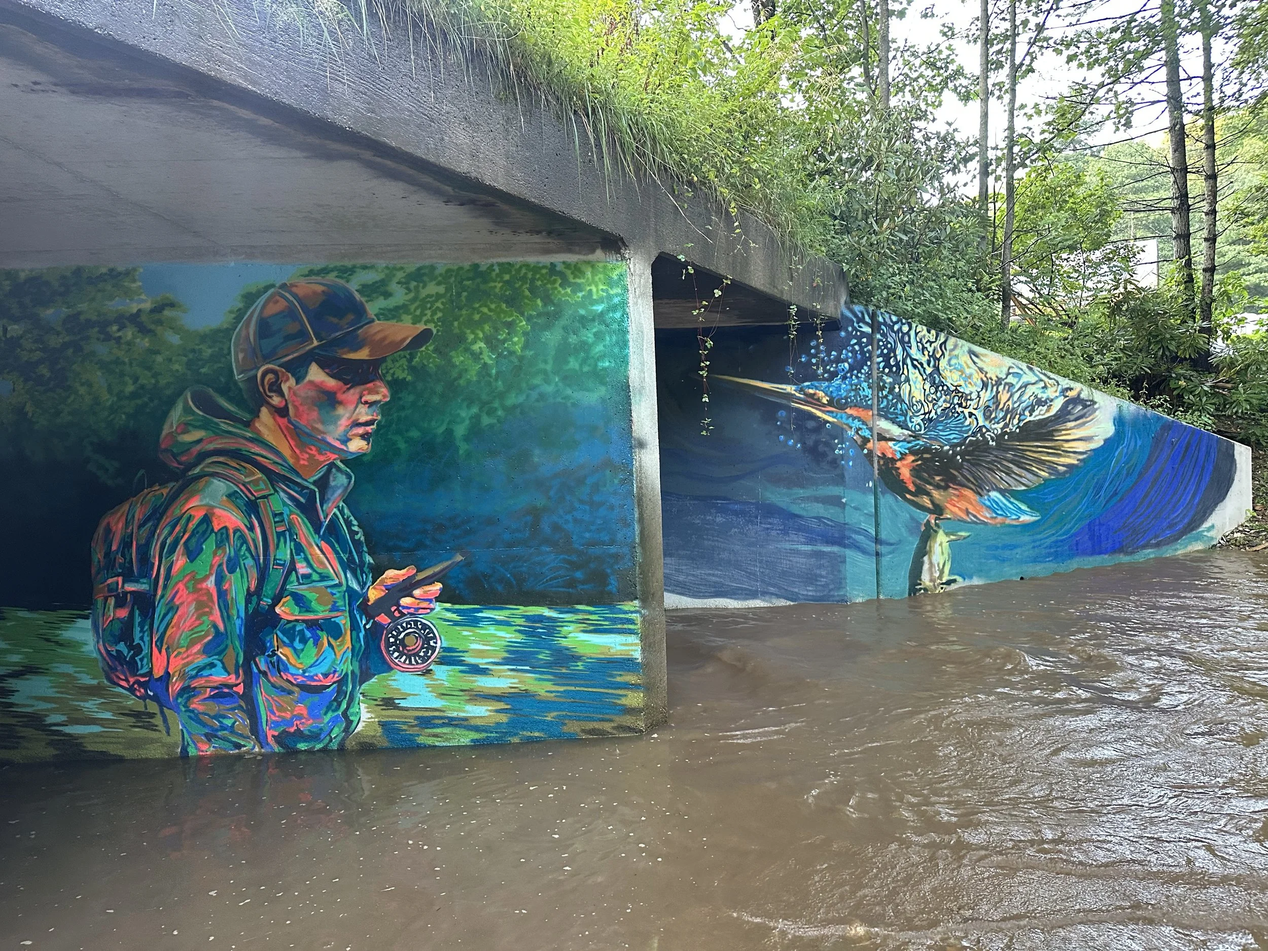 One morning, she looked up from her brushes to find a deer silently watching her work. On another day, a river otter scurried through the tunnel. A group of 12 young women passed by with fly rods in hand, and Whitney, moved by the presence of women in a traditionally male-dominated sport, added a woman fly fishing to one of the murals.